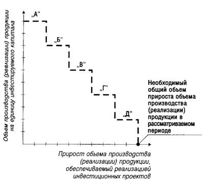 Рисунок 11.12. Графическая модель формирования инвестиционной программы предприятия в условиях ограничений общего объема инвестиционных ресурсов. Из приведенного рисунка видно, что в условиях рассматриваемого ограничения инвестиционная программа предприятия может быть сформирована за счет инвестиционных проектов "А", "Б" и "В" (все остальные проекты по этому критерию должны быть отвергнуты). 8. Оценка сформированной инвестиционной программы по уровню доходности, риска и ликвидности. Совокупная оценка сформированной инвестиционной программы предприятия по этим показателям позволяет оценить эффективность всей работы по ее формированию. Уровень доходности инвестиционной программы определяется на основе общего показателя чистого приведенного дохода или чистой инвестиционной прибыли по всем включенным в нее инвестиционным проектам (рассчитанным в единой размерности времени). Уровень риска инвестиционной программы определяется путем расчета коэффициента вариации по ней (по ожидаемому уровню вариабельности показателей чистого денежного потока или чистой инвестиционной прибыли). Уровень ликвидности инвестиционной программы определяется на основе средневзвешенного коэффициента ликвидности инвестиций по отдельным проектам (взвешенным на объем необходимых инвестиционных ресурсов по ним). Окончательное формирование инвестиционной программы предприятия осуществляется с учетом всех трех ее параметров исходя из приоритетов, определяемых предприятием. Этот процесс характеризуется в инвестиционном менеджменте как обоснование "преферентивных инвестиционных решений". Под этим термином понимается окончательный отбор наиболее предпочтительных для предприятия инвестиционных проектов в его инвестиционную программу, обеспечивающую реализацию его инвестиционной стратегии.