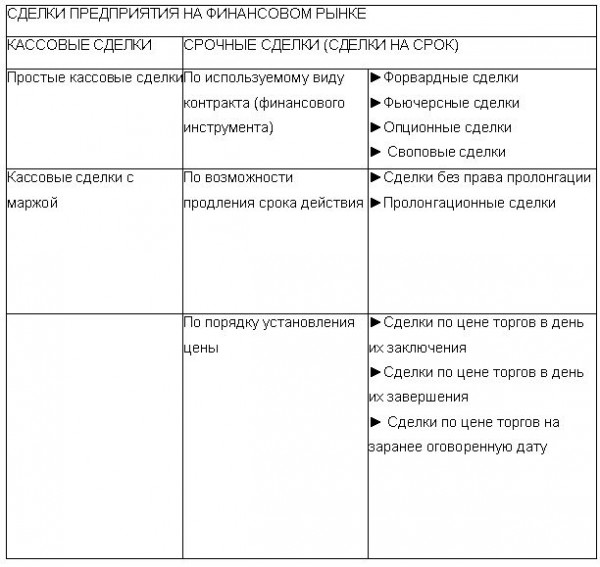 Основу финансовых технологий составляют разнообразные виды сделок и операций, осуществляемых предприятием на организованном и неорганизованном финансовом рынке. В процессе разработки стратегии повышения качества управления финансовой деятельностью предприятия основной задачей в этом вопросе является расширение использования современных видов сделок и операций на финансовом рынке и повышение их эффективности. Под сделками предприятия на финансовом рынке понимаются его взаимосогласованные действия с другими заинтересованными хозяйствующими субъектами, направленные на установление, прекращение или изменение их прав и обязанностей в отношении финансовых инструментов, обращающихся на различных сегментах этого рынка. Сделки, осуществляемые предприятием на организованном и неорганизованном финансовом рынке, характеризуются большим разнообразием видов и классифицируются по следующим основным признакам (рис. 17.4): I. В зависимости от периода реализации условий соглашения выделяют кассовые и срочные сделки с финансовыми инструментами. Кассовые сделки (или сделки "спот") [spot transaction] предполагают, что оплата приобретенных финансовых инструментов и их передача покупателю продавцом осуществляются немедленно или в минимальные технически возможные сроки их исполнения. Общий период исполнения кассовой сделки по финансовым инструментам в зависимости от их вида составляет обычно от двух до четырех дней и определяется по формуле: Общий период исполнения кассовой сделки по финансовому инструменту = День заключения сделки между партнерами + Обусловленный технический срок исполнения сделки. Кассовые сделки по финансовым инструментам могут заключаться как на организованном финансовом рынке