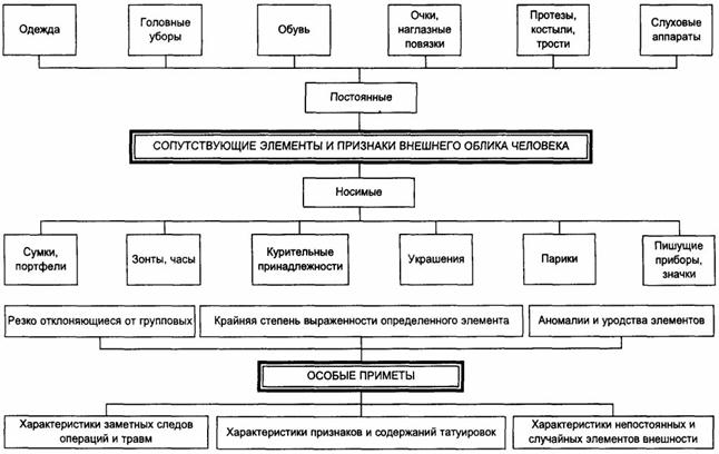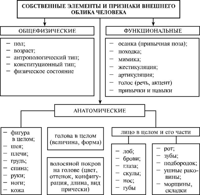 1. Фигура в целом а) Рост - низкий (до 160 см); - средний (161-175 см); - высокий (176-190 см); - очень высокий (более 190 см) (Данные для женщин снижаются на 5 см) б) Телосложение: худощавое; среднее; полное; тучное; коренастое; сутулое; атлетическое в) Особенности 2. Лицо а) Форма: овальное; круглое; прямоугольное; треугольное; ромбовидное б) Цвет: бледное; смуглое; красное; желтое в) Тип: европейское; еврейское; монгольское; кавказское; киргизское и т.д. г) Особенности: худое; морщинистое; румяное; ямочки; выступающие скулы; прыщавое; обрюзгшее; рябое; конопатое 3.Лоб а) высота (в профиль) высокий; средний; низкий б) положение (в профиль): скошенный; вертикальный; наклоненный вперед в) ширина: узкий; средний; широкий г) особенности: лобные бугры; выступание надбровных дуг 4. Брови а) форма: прямые; дугообразные; извилистые б) по ширине: узкие; средние; широкие в) высота (относительно глаз): высокие; средние; низкие г) цвет: темные; светлые; рыжие; седые д) особенности: отсутствие; очень длинные; очень широкие; сросшиеся; густые и т.д. 5. Глаза а) по размеру: большие; средние; малые б) цвет: светлые; голубые; серые; зеленые; желтые; черные; карие в) особенности: очки; косоглазие; навыкате; глубоко сидящие; разноцветные и т.д. 6. Hoc а) по высоте (в профиль): большой; средний; малый б) контуры спинки носа: прямая; выпуклая; вогнутая в) основание: приподнятое; горизонтальное; опущенное г) особенности: приплюснут; вздернут (курносость); свернут; раздвоенность кончика; острый и т.д. 7. Рот а) величина: большой; средний; малый б) особенности: кривой и т.д. 8. Губы а) толщина: толстые; средние; тонкие б) особенности: выступающие; "заячья губа"; отвислость нижней губы и т.д. 9. Зубы а) величина: крупные; средние; малые б) особенности: редкие; кривые; щербатые; желтые; неровные, наличие коронок и т.д. 10. Подбородок а) размер: большой; средний; малый б) положение: выступающий; вертикальный; скошенный в) особенности: раздвоенность; ямка и т.д. 11. Уши а) величина: большие; средние; малые б) форма: треугольные; квадратные; круглые; овальные в) оттопыренность: верхняя; нижняя; общая г) особенности: сросшиеся мочки; наличие прокола в мочке 12. Волосы а) форма: прямые; волнистые; вьющиеся б) размер (по длине): короткие; средней длины; длинные (у мужчин свыше 10 см, у женщин - свыше 30 см) в) цвет: светлые; белокурые; светлорусые; седые; рыжие; темнорусые; темные; черные и т.д. г) особенности: с проседью; крашеные; разноцветные; бакенбарды; подстрижен наголо; коса; облысение лобное, темечное, макушечное, полное, височное, залысина 13. Усы (цвет, форма) 14. Борода (цвет, форма)