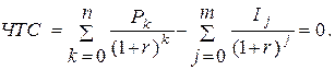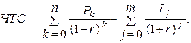 где Pk - годовой доход k-того года, рассчитанный без учета инфляции; Ij - инвестиция j-го года; r - "барьерная" ставка, "стоимость капитала" компании; k - порядковый номер года. ЧТС представляет собой разницу суммы дисконтированного денежного потока и дисконтированной суммы инвестиций, если они проведены в разные периоды, т.е. сопоставляются чистые денежные поступления, приведенные к нулевому периоду с величиной инвестиций. Если ЧТС > 0, то проект следует принять; ЧТС < 0, то проект следует отвергнуть; ЧТС = 0, то проект ни прибылен, ни убыточен. Показатель ЧТС отражает прогнозную оценку роста (снижения) экономического потенциала предприятия в случае принятия рассматриваемого проекта. ЧТС разных проектов может быть суммирован, что позволяет использовать его при анализе оптимальности инвестиционного портфеля. Второй оценочный показатель индекс рентабельности (доходности). Он по сути, является следствием предыдущего критерия - ЧТС и показывает сколько раз инвестиций окупаются за рассматриваемый период или объем дисконтированного денежного потока на рубль инвестиций. Индекс рентабельности рассчитывается по формуле