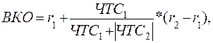 Решая это уравнение относительно r определяется ВКО. ВКО показывает максимально допустимый относительный уровень расходов, которые могут быть ассоциированы с данным проектом. Если проект полностью финансируется за счет ссуды коммерческого банка, то значение ВКО показывает границу допустимого уровня банковской процентной ставки, превышение которого делает проект убыточным. Если, например, берем в банке кредит под 25% годовых, то инвестиция должна иметь ВКО в крайнем случае 25%; если она будет меньше, то мы не сможем вернуть кредит с учетом процентов за счет полученного дохода от инвестиций. Предприятие принимает инвестиции, если ВКО больше текущего значения стоимости капитала (СК). Если ВКО > СК, то проект следует принять; ВКО < СК, то проект следует отвергнуть; ВКО = СК, то проект ни прибылен, ни убыточен. Подсчет ВКО обычно ведут путем итераций. Для этого сначала задаются значением r произвольно. Производят дисконтирование денежного потока и находят ЧТС, ее значение сравнивают с нулем. Если ЧТС > 0, то следующее значение r берут больше, чем первоначальное, и расчеты проводят до появления отрицательного значения ЧТС при изменении r. Фиксируют два значения r: при r1 значение ЧТС1 > 0, а при r2 значение ЧТС2 < 0, и ВКО находят по формуле