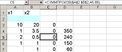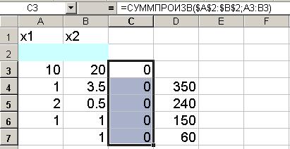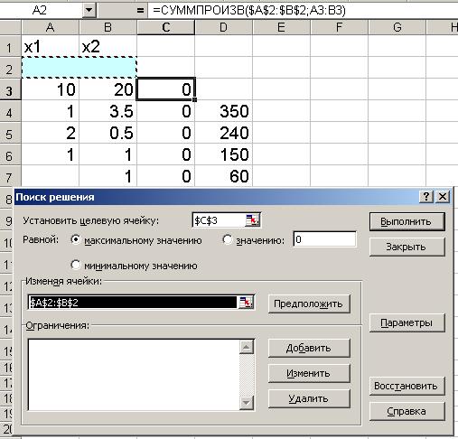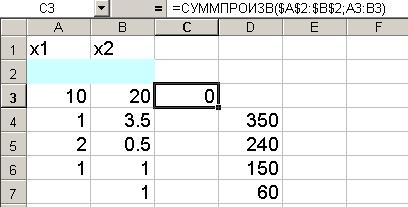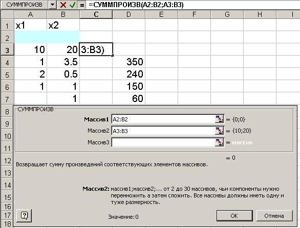 Рис. 3. • В строку «Массив 1» [1] ввести А2:В2 • В строку «Массив 2» ввести А3:В3. Массив 1 будет использоваться при вводе зависимостей для ограничений, поэтому на этот массив надо сделать абсолютную ссылку[2]. На экране: в ячейку С3 введена функция (рис. 4).