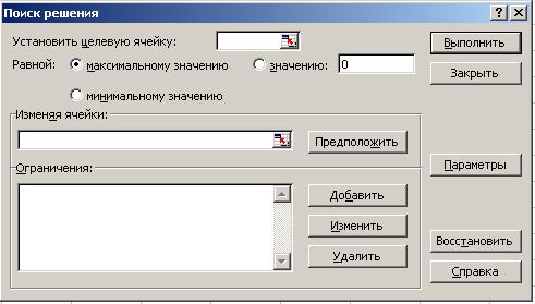 • Курсор в строку «Установить целевую ячейку». • Введите адрес ячейки «$С$3». • Введите направление целевой функциив зависимости от условия вашей задачи: «Максимальному значению» («Минимальному значению»). • Курсор в строку «Изменяя ячейки». • Ввести адреса искомых переменных А$2:В$2. (Рис. 8.)