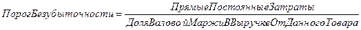 Углубленный операционный анализ – это анализ, в котором часть совокупных постоянных затрат относят непосредственно на данный товар (изделие, услугу). При этом различают прямые постоянные затраты и косвенные постоянные затраты. Универсальный способ — отнесение косвенных постоянных затрат на тот или иной товар пропорционально доле данного товара в суммарной выручке от реализации предприятия. Порог безубыточности товара определяется по формуле: