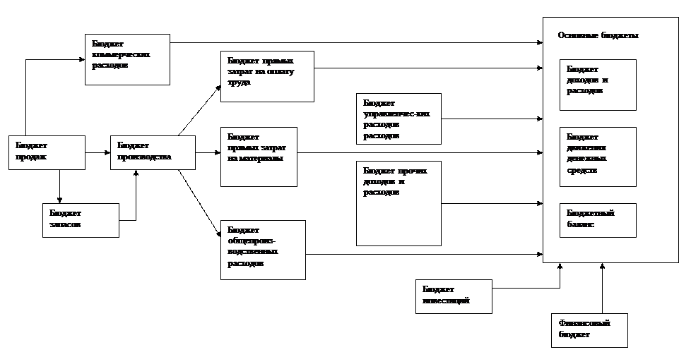 Схема бюджетной модели предприятия. Бюджетная модель каждого предприятия индивидуальна. Вместе с тем существует логика построения бюджетных моделей, отраженная в общей схеме бюджетной модели предприятия на рис.5. При организации бюджетного процесса «снизу вверх» каждый бюджетный период начинается с разработки бюджета продаж. Объем реализации планируется с учетом стратегии предприятия и платежеспособного спроса. Далее на основе бюджета продаж и бюджета запасов формируется бюджет производства. Исходя из запланированных объемов производства рассчитываются прямые затраты на сырье, материалы, оплату труда, а также общепроизводственные расходы. Как правило, при планировании бюджетов прямых затрат используется система норм и нормативов. Объем реализации в значительной степени влияет на формирование бюджета коммерческих расходов, прежде всего, в части переменной составляющей. Бюджеты управленческих расходов, прочих (операционных и внереализационных) доходов и расходов в основном представлены постоянными расходами и непосредственно с объемом реализации не связаны, поэтому большая часть их статей может планироваться автономно. Бюджет инвестиций отражает инвестиционную деятельность предприятия и в основном планируемые в нем статьи определяют денежный поток по инвестиционному виду деятельности. Финансовый бюджет представляет собой, прежде всего, планируемый денежный поток по финансовому виду деятельности, но, как отмечалось в п. 4.4, может включать и операционные расходы в виде процентов за кредиты. Основные бюджеты формируются на основе перечисленных выше операционных и вспомогательных бюджетов, а для планирования ряда статей (основные средства, нематериальные активы, дебиторская задолженность и некоторые другие статьи бюджетного баланса) требуется разработка ряда вспомогательных бюджетов, не отраженных на схеме на рис.5 (это бюджет движения основных средств и нематериальных активов, бюджет дебиторской и кредиторской задолженности, бюджет незавершенного производства и некоторые другие). Изложенный алгоритм планирования, получивший название «снизу вверх», так как начинается в центрах финансовой ответственности, является первой стадией бюджетного процесса, по завершении которой, как правило, необходимы корректировки бюджетов, позволяющие обеспечить достижение необходимых значений ключевых показателей эффективности. Общая схема бюджетной модели представляет собой каркас, на основе которого формируются модели реальных систем бюджетирования. Специфика систем бюджетирования конкретных предприятий определяется отраслевыми особенностями, а также целями и задачами, которые ставит перед системой бюджетного управления предприятием менеджмент. Разработка схемы бюджетной модели является одним из основных этапов построения системы бюджетирования на предприятии. Этому этапу предшествует определение целей и задач системы бюджетирования, формирование финансовой структуры, разработка системы ключевых показателей эффективности. На основе принятой схемы бюджетной модели разрабатываются бюджеты, алгоритмы планирования и формирования факта по статьям, формируется пакет документов, регламентирующих бюджетный процесс.