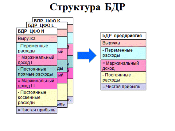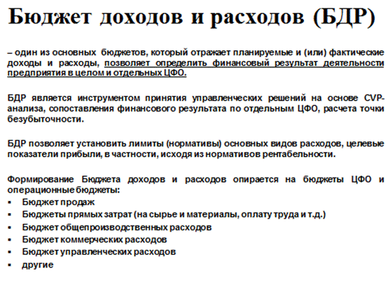 Бюджет доходов и расходов (БДР) – бюджет, который отражает планируемые и (или) фактические доходы и расходы, позволяет определить финансовый результат деятельности предприятия в целом и отдельных ЦФО. БДР является инструментом принятия управленческих решений на основе CVP-анализа, сопоставления финансового результата по отдельным ЦФО, расчета точки безубыточности. БДР позволяет установить лимиты (нормативы) основных видов расходов, целевые показатели прибыли, в частности, исходя из нормативов рентабельности. Формирование Бюджета доходов и расходов опирается на разработку ряда операционных бюджетов. Структура бюджета доходов и расходов различных предприятий может существенно отличаться и зависит от целей и задач системы бюджетирования конкретной компании. Бюджет доходов и расходов может отражать выручку по центрам финансовой ответственности предприятия, по регионам, по видам реализуемой продукции и т.д. Состав статей расходов БДР различных предприятий также может существенно отличаться, так как учитывает цели управления издержками. Расходы предприятия помимо деления на переменные и постоянные (в том числе прямые и косвенные) могут классифицироваться по экономическим элементам, по статьям калькуляции или содержать перечень наиболее значимых для предприятия статей (например, расходы на электроэнергию, расходы на ремонт, расходы на рекламу и т. д.).
