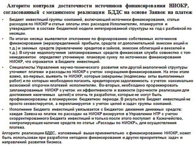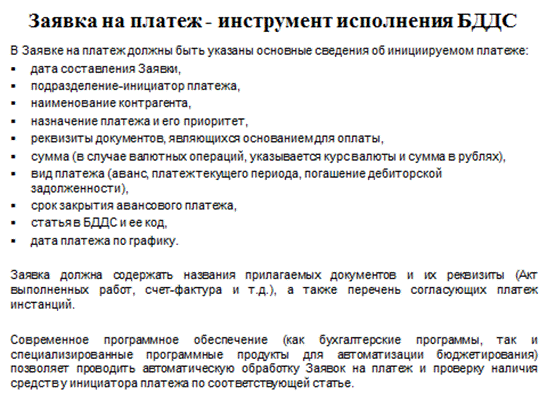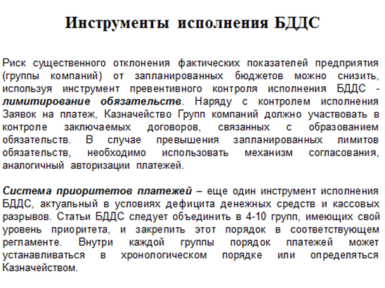 Бюджет движения денежных средств ( БДДС ) – бюджет, который содержит информацию о денежном потоке предприятия в планируемом или анализируемом бюджетном периоде и остатке денежных средств на начало и конец периода. Бюджет движения денежных средств формируется по предприятию в целом, а в случае сложной финансовой структуры - и по отдельным центрам финансовой ответственности. Поступления и выплаты отражаются в БДДС с учетом НДС. При планировании ряда статей этого бюджета можно считать, что платежи осуществляются в том же бюджетном периоде, что и начисление соответствующих доходов и расходов (например, статьи «оплата хозтоваров», «оплата канцтоваров», «оплата прочих управленческих расходов»). Планируемые значения БДДС по таким статьям приравниваются значениям соответствующих статей БДР с поправкой на НДС (при ставке НДС, равной 18%, значение статьи БДДС равно соответствующему значению статьи БДР, умноженному на 1,18). При разработке оперативного БДДС на краткосрочный период (1 - 10 дней) на многих предприятиях используется система заявок, которые составляются отдельными ЦФО и содержат информацию о контрагенте, реквизитах договора, бюджетной статье, другие сведения. Бюджет движения денежных средств является эффективным инструментом управления денежным потоком в рамках системы бюджетирования. БДДС используется для лимитирования и авторизации платежей, а также контроля платежей. Утвержденный БДДС задает лимиты финансирования по статьям расходования денежных средств. Цель установления лимитов – ограничить расходование денежных средств по определенным статьям в условиях дефицита. Возможно установление двух видов лимитов финансирования: ; лимиты расходования платежных средств - величина платежных средств, установленная по каждой статье расходов, в пределах которой осуществляется погашение обязательств и выдача авансов; ; лимиты возникновения (величины) обязательств – величина обязательств, установленная по определенным статьям расходов, сверх которой ответственное лицо или ЦФО не имеет права заключать договоры, принимать работы или проводить какие – либо иные действия, приводящие к возникновению обязательств предприятия перед контрагентами. Авторизация - предоставление полномочий лицу или группе лиц (например, руководителю предприятия или отдельного ЦФО) на разрешение выполнения операций по оплате расходов сверх установленных по статьям БДДС лимитов в пределах своего фонда (резерва на сверхлимитные платежи). На каждом уровне авторизации определяется свой лимит полномочий, в пределах которого возможна авторизация платежей кумулятивно за бюджетный период. В случае исчерпания резерва, в пределах которого возможна авторизация на одном уровне, сверхлимитный платеж должен быть авторизован на более высоком уровне. Исполнение Бюджета движения денежных средств в условиях дефицита денежных средств целесообразно с использованием системы приоритетов платежей, которая разрабатывается с учетом специфики положения предприятия на рынке и особенностей его взаимоотношений с контрагентами. В системе приоритетов платежей приоритет первого уровня - приоритет статьи расходов, определяет последовательность осуществления платежей по статьям (приоритетность статей расходов). Приоритет второго уровня - приоритет плат