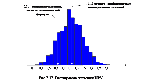 где Dm(t)=M(t)–m(t), причем при t=1 значение m(t) определяется как минимально возможный уровень изменения ставки за один расчетный период, M(t) максимально возможный уровень изменения ставки. Величина B(g, h)=Г(g)Г(h)/Г(g+h), где Г(g)– значение гамма функции. Значения g и h выбираются из следующих соображений. Если прогнозируется тенденция к увеличению ставки, то большим устанавливается значение g, если прогнозируется тенденция к уменьшению ставки, то большим устанавливается значение h (см рис.7.16.). Далее проводится многократное вычисление значение NPV при изменении ставки дисконтирования на каждом периоде расчета. Распределение результатов анализируется. Например, в рассматриваемом примере получили следующую гистограмму значений NPV (Рис.7.17.):