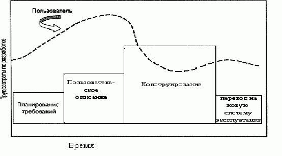 Модель RAD проходит через следующие фазы: · этап планирования требований — сбор требований выполняется при использовании рабочего метода, называемого совместным планированием требований (Joint requirements planning, JRP), который представляет собой структурный анализ и обсуждение имеющихся коммерческих задач; · пользовательское описание — совместное проектирование приложения (Joint application design, JAD) используется с целью привлечения пользователей; на этой фазе проектирования системы, не являющейся промышленной, работающая над проектом команда зачастую использует автоматические инструментальные средства, обеспечивающие сбор пользовательской информации; · фаза конструирования ("до полного завершения") — эта фаза объединяет в себе детализированное проектирование, построение (кодирование и тестирование), а также поставку программного продукта заказчику за определенное время. Сроки выполнения этой фазы в значительной мере зависит от использования генераторов кода, экранных генераторов и других типов производственных инструментальных средств; · перевод на новую систему эксплуатации — эта фаза включает проведение пользователями приемочных испытаний, установку системы и обучение пользователей.