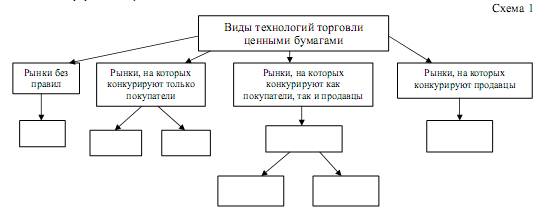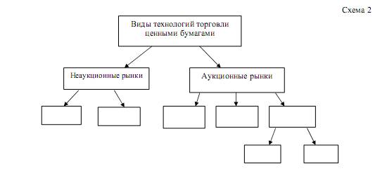 2. Дайте сравнительную характеристику российских и зарубежных фондовых бирж (рекомендуется в табличной форме). 3. Классифицируйте рынки ценных бумаг по видам применяемых технологий торговли. Заполните схемы 1 и 2, используя приведенные ниже понятия: - Двойной аукционный рынок - Онкольный рынок - Дилерский рынок - Непрерывный аукцион - Стихийный рынок - Простой аукционный рынок - Рынок голландских аукционов