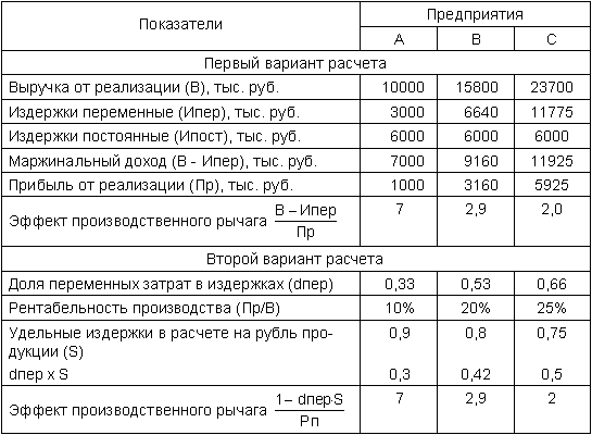 Наличие постоянных затрат в составе издержек приводит к тому, что с увеличением объема реализации удельная величина названных издержек в расчете на единицу продукции уменьшается и соответственно увеличивается прибыль как в расчете на единицу продукции (при постоянной цене), так и в расчете на весь объем реализации. При этом чем выше доля постоянных затрат, тем больший прирост прибыли можно достичь за счет увеличения объема продаж. Таким образом, каждый процент увеличения объема продаж может обеспечить больший процентный рост прибыли. Данная закономерность отражает так называемый эффект производственного рычага, или эффект масштаба, сила воздействия которого зависит от структуры затрат, доли в них постоянных издержек. Отсюда, однако, не следует делать безусловный вывод о том, что высокая доля постоянных расходов имеет только положительный эффект. Это верно лишь при наличии надежной долгосрочной перспективы повышения спроса на продукцию (услуги) предприятия. Высокая доля постоянных затрат может дать и значительный отрицательный эффект с уменьшением объема производства, так как в этом случае постоянные расходы на единицу продаж существенно возрастают, соответственно прибыль (на единицу объема продаж и в целом) уменьшается. Подобная ситуация вполне реальна при ухудшении конъюнктуры рынка продукции предприятия. В связи с этим предприятие с относительно высоким уровнем эффекта производственного рычага характеризуется и более высоким производственным риском, т.е. риском непокрытия производственных затрат за счет выручки. Таким образом, любое изменение выручки от реализации порождает еще более сильное изменение прибыли. Анализируя деятельность предприятия, можно установить, насколько эффективно оно решает задачу максимизации темпов прироста прибыли путем управления структурой затрат, определяя рациональные границы роста (изменения) как переменных, так и постоянных затрат, обеспечивая разумную экономию прежде всего постоянных, в том числе управленческих расходов. В практических расчетах сила воздействия (эффект) производственного рычага (Эпр) рассчитывается по формуле:
