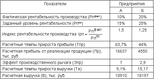 С ростом объема производства и выручки увеличивается прибыль; соответственно уменьшается дробь При скачкообразном росте постоянных затрат, диктуемом, как правило, интересами роста выручки, предприятию приходится проходить новый порог рентабельности и эффект производственного рычага растет. Затем с ростом объема продаж сила воздействия производственного рычага опять снижается. Таким образом, на небольшом удалении от порога рентабельности эффект производственного рычага максимальный; с ростом масштаба производства и запаса финансовой прочности он уменьшается до нового скачка постоянных затрат. В общем случае, пользуясь оценкой эффекта производственного рычага, можно оперативно определять величину прибыли и рентабельности производства исходя из информации о темпах роста (или уменьшения) выручки от реализации продукции (работ, услуг). Этот же метод позволяет решать и обратную задачу — определять объемы реализации, которые необходимы для получения заданной прибыли. Решение подобной задачи на условном примере представлено в таблице 4.3. Таблица содержит расчеты по определению выручки, необходимой для достижения уровня рентабельности не ниже заданного. Таким образом, для достижения уровня рентабельности не ниже заданного темпы прироста выручки по предприятиям А и В должны составить соответственно 9,1% и 15,17%. Задача финансового менеджмента — определить способы наращивания выручки, включая возможности ценового регулирования. Объединяя формулы (4.17) и (4.18), можно получить модель темпа прироста прибыли (Тпр), которая позволяет непосредственно оценить влияние на Тпризменения цен: