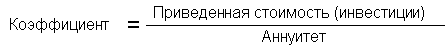 Чем выше индекс, тем эффективнее проект. Если PI=1 (в этом случаe NPV=0), то проект обеспечивает получение прибыли на уровне ставки дисконтирования и более. Если PI меньше 0, то проект не обеспечивает получение минимальной нормативной прибыли. Коэффициент 1,0 выражает “нулевой” NPV. Внутренняя норма прибыли (Internal Rate of Return — IRR), или внутренняя норма окупаемости инвестиций является специальной ставкой дисконтирования, при которой суммы поступлений и отчислений денежных средств, в течение срока экономического жизненного цикла инвестиций дают в результате нулевую NPV,? а именно ставка дисконтирования, при которой приведенная стоимость денежных поступлений равна приведенной стоимости отчислений денежных средств. Естественно, что IRR в значительной мере зависит от сроков экономического жизненного цикла и времени поступления денежных средств. В случаях с NPV и коэффициентом рентабельности применяется специальная заранее предполагаемая норма прибыли для дисконтирования денежного потока. Напротив, в случае с IRR мы рассмотрим проблему в направлении определения ставки дисконта, при которой сумма поступлений денежных средств будет равна сумме использованных денежных средств. Мы можем снова использовать нашу простую формулу (Текущая приведенная стоимость = Коэффициент х Аннуитет), если в соответствии с условиями проекта предусматривается инвестирование одинаковой суммы затрат и одинаковый уровень ежегодных денежных поступлений. Затем получим формулу: