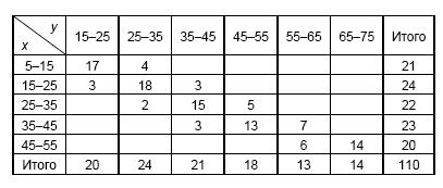 Решение. Составим корреляционную таблицу, в качестве вариант выберем середины интервалов.