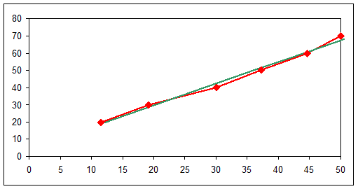 Построим графики линий регрессии на одном чертеже с эмпирическими линиями регрессии.