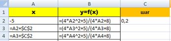 2. При определении значений аргумента следует помнить, что при каких значениях функция не определена. На рис. видно, что значение аргумента задано в два этапа, не включая (-2) с шагом 0,2. 3. Введите формулу(см.рис)