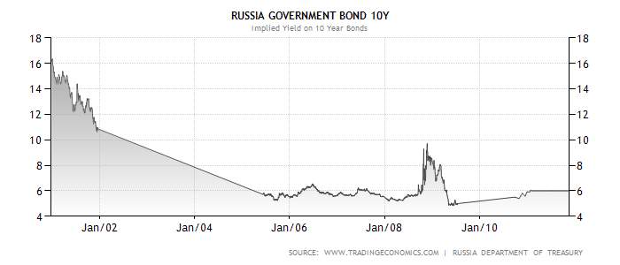 Необходимым звеном, в понимании наступления и реализации рисков, является суверенный риск (риск неисполнения обязательств государствами по выпущенным займам). С учетом наращенных долей обязательств иностранных государств, а также Российской Федерации, в инвестиционном портфеле «Связь-Банка» появляется нужда в рассмотрении рисков реализации суверенного риска и переходе его в индивидуальный кредитный риск (так как любое обязательство до даты погашения носит рисковый характер). В связи с тем, что в структуре активов нет разбивки по видам стран, к рассмотрению берутся страны ЕВРОЗОНЫ и США и России по системе оценок суверенного риска euromoney countries risks[ii],. Россия: несмотря на ухудшение в мировой экономической ситуации, в период с 2007 по 2008 год, ВВП в текущих ценах показывал высокий рост (от 33 до 41 миллиарда в долларах США), показав снижение только в 2009 году (до 39 млрд. долларов). Торговый баланс так же был положительным (изменившись с 2007 года от 130.9 до 179.7 в 2008 году, снизившись в 2009 году до 112.1 млрд. долларов США). Приток внешних инвестиций в экономику РФ на момент 2008 года составил 27 миллионов долларов США, снизившись в 2009 году до величины 15.9 миллионов. Главными инвесторами выступили Люксембург и Нидерланды. Доходность от вложений в долговые обязательства к 2009 значительно выросла, что свидетельствует о высокой степени доверия к этому инструменту со стороны участников рынка в кризисный период. Динамика внешнего долга показывает негативные изменения, но вместе с тем общий присвоенный рейтинг ECR признается как средне-стабильный (ECR score 49.7 -2008; ECR rank 50). Наступление невыполнения по своим обязательствам маловероятно.