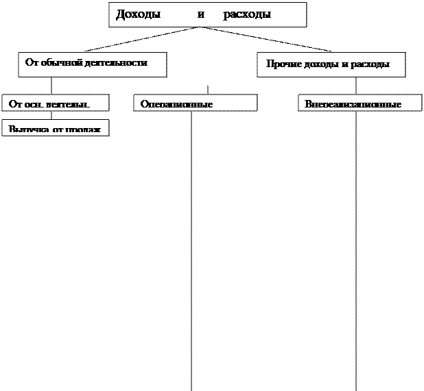 Рис.1. Схема образования прибыли согласно формы 2 В форме № 2 «Отчет о прибылях и убытках», составляемом на основе данных аналитического бухгалтерского учета по счете 99 «Прибыли и убытки», финансовый результат отражается в развернутом виде как: 1.Сальдо доходов и расходов по обычным видам деятельности; 2.Сальдо операционных доходов и расходов; 3.Сальдо внереализационных доходов и расходов; 4..Сальдо чрезвычайных доходов и расходов. Изобразим структуру формы № 2 графически (рис.3). Доходами от обычных видов деятельности являются выручка от продажи продукции и поступления связанные с выполнением работ и оказанием услуг по основной деятельности, а расходами являются расходы, связанные с изготовлением продукции и ее сбытом. Операционные доходы и расходы возникают в результате проведения определенных хозяйственных операций. К ним относятся: - предоставление за плату в лизинг или аренду активов предприятия; - предоставление за плату прав, возникающих из патентов, изобретений и других видов интеллектуальной собственности, принадлежащей предприятию; - участие в работе других предприятий; - продажа выбывших или излишних основных средств и других активов предприятия; - получение и предоставление кредитов и займов и некоторые другие. Внереализационные доходы и расходы возникают в результате определенных фактов хозяйственной жизни, как правило, не зависящих от предприятия. К ним относятся: - штрафы, пени, неустойки за нарушение условий договоров; - суммы дооценки активов (кроме внеоборотных); - курсовые разницы и т.д. К чрезвычайным доходам и расходам относят в основном страховые выплаты за ущерб от стихийных бедствий, аварий и т.д.