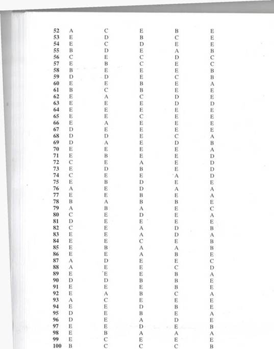 97. В зимнее время допускается разряд батареи без подзаряда не более чем на.... A) 55% B) 25% C) 35% D) 65% E) 15% 98. Каковы наиболее вероятные причины медленного увеличения скорости при нажатии на педаль акселератора? A) Отсутствие свободного хода; B) Заедание рычажков выключения сцепления; C) Износ подшипника муфты выключения сцепления D) Большой свободный ход педали муфты сцепления; E) Попадание воздуха в гидропривод усилителя; 99. При замере люфта с помощью люфтомера - динамометра на легковых автомобилях усилие, прикладываемое к рулевому колесу, не должно превышать... A) 50н B) 40н C) ЗОн D) 20н E) Юн 100. Проверка герметичности устройств и соединительных трубок пневматического тормозного привода производится... A) По включению контрольных ламп на щитке приборов автомобиля B) Всеми указанными способами C) На слух D) По показаниям манометра E) С помощью специальных стендов и контрольных приборов