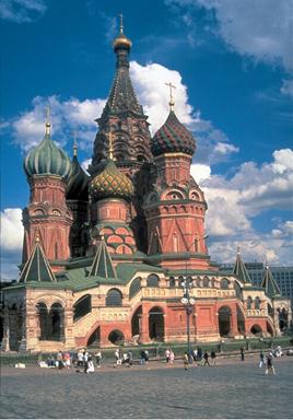 If you walk up into Red Square from the North on a snowy winter morning, you will be treated to a breathtaking sight. Like a colorful toy resting in the palm of this cobblestone field, the Cathedral of St.Vasily (Basil) the Blessed climbs into view, its jeweled domes looking more like a circus attraction than a national shrine. Perched high above the Moskva River, flanked by the stolid, gothic towers of the Kremlin fortress and the creeping commerciality of GUM, the church radiates an architectural self-confidence that is at once appealing and awe-inspiring. It is so amazingly out of place, and yet so perfectly set.