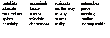 Ex. 30. Mind the features in both texts which are characteristic for tourist guides: a) popular active words b) forms c) grammar (verb tenses) and structure (sentences) d) structure of the texts Ex. 31. Find the words in the texts, which mean the following