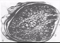 Рис. Зигота человека в стадии сближения мужского и женского ядер (пронуклеусов): (по Б.П.Хватову). 1 — женское ядро; 2 — мужское ядро.