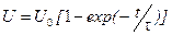 где А – некоторая постоянная, которая определяется из начальных условий, а произведение RC - постоянной времени цепи. Если R выражается в Омах, а С – в Фарадах, то постоянная времени t = RC выражается в секундах.. Если в момент t =0, т.е. при замыкании ключа (Рис. 2.15), напряжение на конденсаторе U =0, то А=-U0 и напряжение на выходе RC цепи будет изменять во времени по закону: