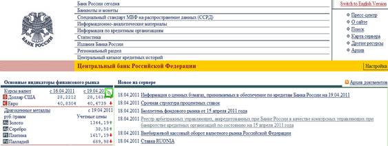 Центральный банк Российской Федерации www.cbr.ru На сайте Центрального банка Российской Федерации ежедневно публикуется информация о состоянии финансовых рынков, состоянии банковской системы и параметрах денежно-кредитной политики. Это и устанавливаемые Банком курсы валют (для отдельных валют ежедневно, для некоторых – ежемесячно), и информация об объемах выданных кредитными организациями кредитов и привлеченных депозитов, ежедневные данные о торгах на рынке ГКО, ОФЗ, ОБР, процентные ставки, данные о величине денежной массы и денежной базы и многое другое.