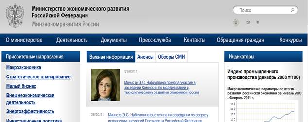 Министерство экономического развития www.economy.gov.ru Сайт Министерства экономического развития (МЭР, ранее – МЭРТ). Здесь можно найти публикации кратко-, средне- и долгосрочных прогнозов социально-экономического положения в РФ. Прогнозы обычно составляются для нескольких сценариев развития. Публикуются как ключевые прогнозные показатели (ВВП, товарооборот, инвестиции, экспорт, импорт, заработная плата и т.д.), так и соответствующие им значения экзогенных переменных (обычно это цена на нефть и объем ее добычи, курс рубля по отношению к доллару США и доллара США к евро, величина инфляции, расходы бюджета и т.д.), заложенные в те или иные сценарии развития.