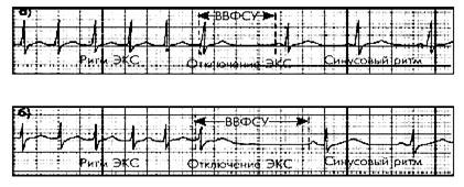 Вначале искусственный ритм, навязанный сердцу электрокардиостимулято-ром (ЭКС), на 5-10 уд. в мин превышает исходный собственный синусовый ритм. Стимуляцию проводят в течение 1-2 мин. Затем постепенно, ступене-образно каждые 3-5 мин повышают частоту навязанных стимулов, доводя ЧСС до 150-170 в мин. После получения навязанного ритма отключают ЭКС и измеряют время, в течение которого происходит восста-новление функции САУ (ВВФСУ), которое соответствует первому самостоятельному возбуждению предсердий - первому зубцу Р. Рисунок 19 Исследование времени восстановления синусного узла