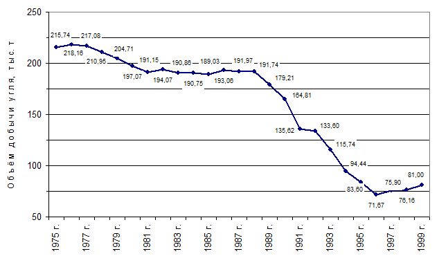 Рисунок 1.1 – Динамика объема добычи угля в Украине за 1975-1999 гг. Причинами этого (помимо объективных — углубление горных работ, усложнение условий разработки пластов и др.) явились старение шахтного фонда, изношенность оборудования, отсутствие высокоэффективной выемочной техники. В последние годы к ним прибавились еще и организационные неурядицы, забастовки шахтеров и неудовлетворительное материально-техническое снабжение (недопоставки оборудования, лесных материалов, металлических крепей и других материалов производственного назначения). Все это привело к заметному снижению объемов добычи угля в Украине (см. табл. 1.2 и рис. 1.1). Так, с 1990 г. по 1996 г. добыча снизилась со 161,8 до 71,7 млн. т (на 93,1 млн. т или в 2,3 раза). В 1997 году падение производства удалось остановить, и впервые был получен прирост добычи угля. В 1999 году добыча возросла до 81 млн. тонн. Вместе с тем, программа развития угольной промышленности Украины и ее социальной сферы до 2005 г. предусматривает повышение объема добычи с последующей стабилизацией на уровне 165..170 млн. тонн в год. Необходимость этого обусловлена возрастанием роли угля как энергетического топлива в связи с уменьшением поставок в Украину нефти и газа и принятым курсом на обеспечение страны внутренними энергоресурсами. Программой предусматривается осуществить комплекс мероприятий, направленных на повышение конкурентоспособности угля, за счет увеличения мощности вновь строящихся и реконструируемых шахт; увеличения объема добычи угля открытым способом; комплексной механизации основных и вспомогательных процессов при ведении горных работ. В Украине в 2005–2010 гг. в связи с отработкой запасов предполагается выбытие более 40% ныне действующего шахтного фонда. Для его восполнения предусмотрено строительство новых предприятий на разведанных угленосных площадях Западного, Южного и Северного Донбасса, Юго-Западного района Львовско-Волынского бассейна, ряда месторождений бурых углей для открытых работ в Днепровском бассейне и Днепровско-Донецкой впадине. Только в Донбассе подготовлено 49 участков для закладки новых шахт. Запасы угля в них оцениваются в 9,3 млрд. т, что обеспечит создание мощностей по добыче свыше 100 млн. т угля в год. Эти участки находятся в Красноармейском районе и Южном Донбассе (коксующиеся угля); в Западном (Павлоградско-Петропавловский и Лозовской районы) и Северном Донбассе (Богдановское и Перовское месторождения) — угли энергетических марок. В Львовско-Волынском бассейне для строительства новых шахт подготовлено четыре участка. Установлена перспектива для разработки коксующихся углей в Юго-Западном районе бассейна (Тяловское и Карловское месторождения). Выявленные здесь запасы улей (около 1,1 млрд. тонн — более половины запасов ранее известных районов бассейна) позволяют построить 8-9 шахт общей мощностью до 10 млн. тонн угля в год. Это даст возможность продлить использование бассейна более чем на 50 лет. Кроме того, в этом районе также обнаружены запасы германия и шахтного метана. В Днепровском буроугольном бассейне для восполнения выбывающих предприятий и дальнейшего развития добычи бурых углей подготовлено 8 месторождений (суммарная проектная мощность проектируемых предприятий — 11,5 млн. т в год), из них 4 — для открытых работ. За пределами бассейна в Днепровско-Донецкой впадине