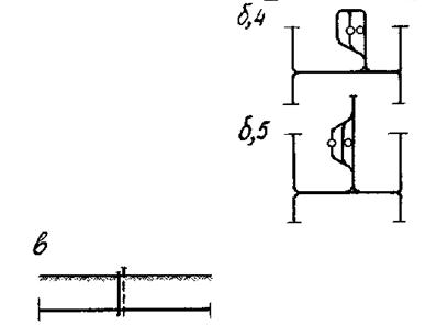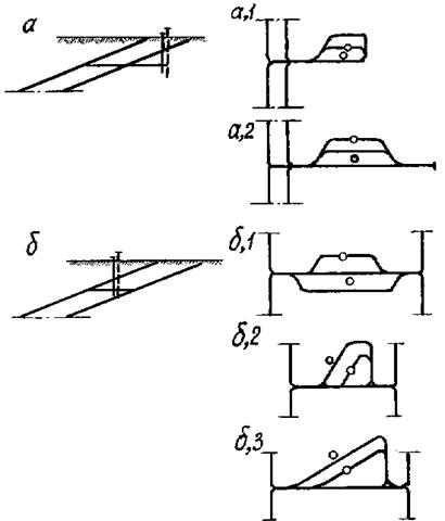 При вскрытии свиты пластов (пласта) квершлагом со стороны лежачего бока (рис. 11.6, а) или висячего могут применяться либо петлевые (а, 1), либо тупиковые (а, 2) околоствольные дворы с односторонним поступлением в них грузов. При расположении вертикальных стволов на квершлаге между пластами (рис. 11.6, б) могут встречаться самые различные схемы привязки в зависимости от длины квершлага и ориентировки транспортных ветвей. При большом расстоянии между пластами желательно (если это возможно по ориентировке ветвей) иметь околоствольный двор параллельного типа (б, 1) с тем, чтобы максимально использовать длину квершлага в качестве транспортной ветви околоствольного двора. Уместно отметить, что длина современных дворов составляет 200..300 м и более. Если же расстояние между пластами по квершлагу меньше указанных значений, то необходимо применять другие схемы привязки и, следовательно, другие схемы околоствольных дворов, а именно: круговые перпендикулярные (б, 2), диагональные (б, 3) и петлевые (б, 4) или тупиковые (б, 5). При вскрытии одиночного пласта вертикальными стволами без дополнительных вскрывающих выработок главной примыкающей выработкой будет являться главный штрек с двусторонним поступлением составов в околоствольный двор. В таких случаях возможно применение одной из схем привязки, приведенных на рис. 11.6 (б, 1, б, 2 и б, 3).