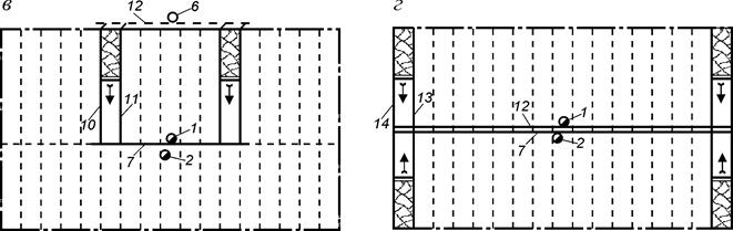 Подготавливающими выработками здесь являются: в бремсберговой ступени — капитальный бремсберг, вспомогательный бремсберг и вентиляционный ходок капитального бремсберга, а также этажные штреки; в уклонной ступени — капитальный и вспомогательный уклоны, вентиляционный ходок капитального уклона и этажные штреки. Подготовка пласта начинается с проведения главных наклонных выработок — капитального и вспомогательного бремсбергов и вентиляционного ходка. Как правило, эти выработки проводятся сверху вниз, т. е. от верхней границы шахтного поля до горизонта околоствольного двора. Обусловлено это тем, что проходка вентиляционного ствола (шурфа) заканчивается раньше, чем главного и вспомогательного из-за его значительно меньшей длины и более простого его оборудования. Кроме того на газоносных пластах проведение выработок сверху вниз предпочтительнее, поскольку исключаются скопления метана в подготовительных забоях. От капитального бремсберга через определенные расстояния, равные наклонной высоте этажа, в обе стороны проводят этажные штреки. Нижний этажный штрек является транспортным, по нему также движется свежий поток воздуха. Верхний штрек вентиляционный и служит для отвода исходящего потока воздуха. В каждом крыле этажа проводятся разрезные печи для монтажа в них забойного оборудования лав. В зависимости от принятого порядка отработки крыла этажа разрезные печи проводятся на расстоянии 40..60 м от наклонных выработок (при прямом порядке) или же у границ этажа при обратном порядке. После отработки запасов первого этажа очистные работы ведут во втором, для чего проводят новые этажные штреки. В некоторых случаях в качестве вентиляционного используется бывший транспортный штрек вышележащего отработанного этажа. При доработке запасов в бремсберговой ступени заблаговременно приступают к подготовке уклонного поля. С этой целью на длину наклонной высоты этажа проводят капитальный уклон и параллельно ему вспомогательный уклон и вентиляционный ходок (рис. 14.1, б). Работы в этажах проводят по аналогии с таковыми в бремсберговой ступени. Отличие состоит в том, что в каждом этаже сооружается водоотливный комплекс — насосная камера с водосборниками, а также электроподстанция. Схема транспортирования угля при этажной подготовке шахтного поля (по рис. 14.1): – для бремсберговой ступени (а): лава — этажный транспортный штрек — капитальный бремсберг — капитальный транспортный квершлаг — главный ствол. Или по цифровым обозначениям выработок: лава–7–4–3–1; – для уклонной ступени (б): лава–7–13–3–1. Схема проветривания шахтного поля при этажном способе подготовки (по рис. 14.1): – при отработке бремсберговой ступени (а): 2–3–5–7–лава–8–6–10–11; – при отработке уклонной ступени (б): 2–3–14–7–лава–8–12–15–1. Если главный ствол отстоит далеко от коренного штрека или проведение вентиляционной сбойки 15 затруднительно, то для обеспечения проветривания уклонного поля необходимо проводить коренной вентиляционный штрек и капитальный вентиляционный квершлаг параллельно соответствующим транспортным выработкам штреку и квершлагу. Достоинства этажного способа подготовки: – небольшой объем подготавливающих выработок по сравнению, например, с панельной подготовкой, а следовательно, меньшие первоначальные капитальные затраты и более 