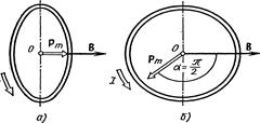 Так как в начальном положении контур установился свободно (положение устойчивого равновесия), то момент внешних сил, действующий на контур, равен нулю. В этом положении вектор магнитного момента Рис. 17 pm контура сонаправлен с вектором В (рис. 17, а) и магнитный поток Ф1 максимален (a=0, cos a=1), т. е. Ф1 =ВS (где S — площадь контура). В конечном положении (рис. 17, б) вектор pm перпендикулярен вектору B (a=p/2, cos a=0) и магнитный поток Ф2=0. Перепишем выражение (1) с учетом сделанных замечаний: