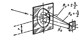 Число зон Френеля, помещающихся в отверстии, убывает по мере удаления экрана от отверстия. Наименьшее четное число зон равно двум. Следовательно, максимальное расстояние, при котором еще будет наблюдаться темное пятно Рис. 4 в центре экрана, определяется условием, согласно которому в отверстии должны поместиться две зоны Френеля. Из рис. 4 следует, что расстояние от точки наблюдения O на экране до края отверстия на 2 ( λ /2) больше, чем расстояние bmax. По теореме Пифагора получим