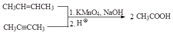 Аналогично при окислении щелочным раствором перманганата калия алкинов получают карбоновые кислоты. Так, например, уксусную кислоту можно получить, окисляя либо 2-бутен, либо 2-бутин.