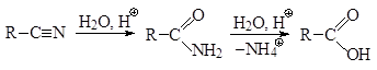 а) Гидролиз. При нагревании нитрилов с водными растворами сильных минеральных кислот происходит их гидролиз сначала до первичных амидов, которые далее гидролизуются до карбоновых кислот.