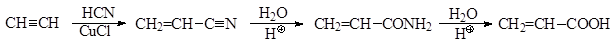 Наибольшее практическое значение среди α,β-ненасыщенных карбоновых кислот имеют акриловая и метакриловая кислоты. Акриловую кислоту и ее важнейшие производные – акрилонитрил, акриламид – получают на основе простейших ненасыщенных углеводородов – ацетилена, этилена и пропилена: ¨ при присоединении к ацетилену циановодорода образуется нитрил акриловой кислоты (акрилонитрил), который сам является важным промышленным продуктом и при гидролизе которого могут быть получены акриламид и акриловая кислота: