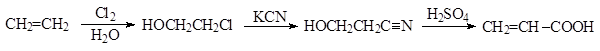¨ образующийся при взаимодействии этилена с хлором в воде этиленхлоргидрин взаимодействием с цианидом калия превращают в этиленциангидрин, который одновременно дегидратируют и гидролизуют при нагревании с водной серной кислотой до акриловой кислоты: