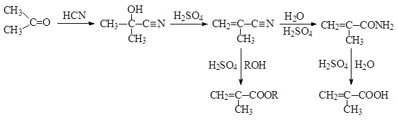 Метакриловую кислоту и ее производные – нитрил, амид, сложные эфиры – получают из ацетона через его циангидрин по следующей схеме: