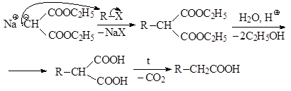 Натрмалоновый эфир представляет собой С-нуклеофил, который может быть подвергнут алкилированию с помощью алкилгалогенида по механизму SN2 с образованием алкилзамещенного малонового эфира. Этот эфир кислотным гидролизом переводят в алкилзамещенную малоновую кислоту, при нагревании которой в результате декарбоксилирования образуется карбоновая кислота, которую можно рассматривать как алкилзамещенную уксусную кислоту.