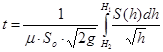 Хотя коэффициент расхода μ может зависеть от скорости истечения (а следовательно от h), его приближённо принимают постоянным. Входящий в (2.2) интеграл может быть в случае резервуара произвольного сечения подсчитан одним из способов приближённого интегрирования. Если S=const, то интеграл в (2.2) может быть подсчитан аналитически