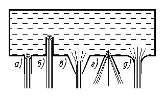 На практике часто бывает необходимо увеличить коэффициент расхода, добиться сохранения формы струи (гидромонитор, брандспойт) и т.п. Для этой цели в технике применяют различные насадки. Насадкой называется короткая труба, присоединённая к отверстию в тонкой стенке. Обычно длина насадка, заключена в пределах от 3d до 5d, где d – диаметр отверстия, равный внутреннему диаметру насадка. Насадки влияют на коэффициенты скорости и сжатия струи, а тем самым на величину коэффициента расхода