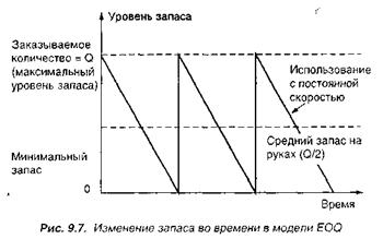 Независимая версия зависимого спроса. Модели управления запасами предполагают, что спрос на определенное изделие или независим, или зависим от спроса на другие изделия. Например, спрос на холодильники обычно не зависит от спроса на печи для тостеров. Многие проблемы запасов, однако, взаимосвязаны: спрос на одни изделия зависит от спроса на другие изделия. Рассмотрим производителя небольших мощных садовых косилок. Спрос на колеса для садовых косилок и штепсельные вилки существует для каждой изготовленной косилки. Четыре колеса и одна штепсельная вилка необходимы для каждой из них. Обычно, когда спрос на различные изделия зависим, соотношения между изделиями известны и постоянны. В этом случае планирование производства базируется на спросе на конечные изделия, а компьютер определяет потребности в компонентах. В этой главе сосредоточено внимание на управлении спросом на независимые изделия. В главе 10 излагается материал о зависимом спросе. Типы моделей управления запасами. В этом разделе мы введем понятие модели управления запасами, позволяющей получить ответ на два возможных вопроса, которые прилагаются к складируемому изделию: 1) когда размещать заказ на изделие; 2) как много изделий надо заказывать для пополнения запаса. Мы рассмотрим четыре модели, не зависящих от спроса. 1. Модель экономичного (по количеству) заказа (EOQ); 2. Модель производственного (по количеству) заказа; 3. Модель заказа с резервным запасом; 4. Модель с дисконтируемым количеством. Основная модель экономичного заказа (EOQ). Экономичный заказ является одной из старейших и наиболее часто используемых техник управления запасом. Исследования отсылают нас к публикации 1915 года, написанной Фордом У. Харрисом. EOQ и сегодня используется в большом количестве организаций. Этой техникой легко пользоваться, но она требует многих допущений. Наиболее существенные допущения следующие. 1. Спрос известен и постоянен. 2. Текущее время, время между размещением заказа и получением заказа известно и постоянно. 3. Получение заказа немедленное. Другими словами, заказанный запас поступает в одной партии, в одно время. 4. Понижение (дисконт) количества невозможно. 5. Переменными являются только затраты на переналадку или размещение заказа (затраты на переналадку) и затраты на хранение или складирование запасов во времени (затраты хранения, или текущие затраты). Эти затраты обсуждались в предыдущем разделе. 6. Дефицит (нехватка) совершенно исключены, если заказ размещен вовремя. С этими допущениями график использования запасов во времени имеет форму зубьев пилы, как это представлено на рис. 9.7. На рис. 9.7 Q представляет количество, которое заказывается. Если это количество 500 платьев, все 500 платьев прибывают в одно время, когда получают заказ. Таким образом, уровень запаса совершает прыжок от 0 до 500 платьев. В общем случае уровень запаса повышается от 0 до Q единиц, когда заказ поступает.