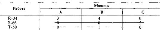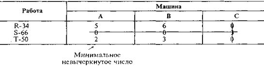 Шаг 2. Зачеркнем минимальным числом прямых линий все нули. Поскольку только две линии пересекают таблицу, решение не является оптимальным. Шаг 3. Вычтем минимальное нсзачеркнутое число (2 в этой таблице) из