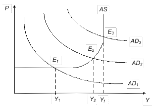 Макроэкономическое равновесие означает оптимальный вариант выбора в экономике, т. е. сбалансированность совокупного спроса и предложения, производства и потребления, ресурсов и их использования, факторов производства и его результатов, материально-вещественных и финансовых потоков (рисунок 9.5). Рисунок 9.5 – Варианты макроэкономического равновесия Пересечение кривых AD и AS определяет точку макроэкономического равновесия (Е), равновесный объем национального производства и равновесный уровень цен. Равновесные характеристики могут возникать на разных отрезках кривой совокупного предложения. На графике представлены три варианта возможного макроэкономического равновесия. Точка E 1 показывает равновесие при неполной занятости без повышения уровня цен, т. е. без инфляции. Точка E 2 – равновесие при небольшом повышении уровня цен и состоянии, близком к полной занятости. Точка E 3 – равновесие в условиях полной занятости, но с инфляцией. Под влиянием неценовых факторов могут происходить сдвиги кривых AD и AS и установление новой точки равновесия. Последствия изменения AD зависят от того, на каком отрезке AS происходят сдвиги: а) на горизонтальном отрезке AS изменение AD ведет к равнонаправленному изменению реального объема выпуска при неизменных ценах; б) на вертикальном отрезке AS изменение AD приводит к равнонаправленному изменению цен при неизменном объеме выпуска; в) на промежуточном отрезке AS рост AD порождает как рост реального объема выпуска, так и определенный рост цен.