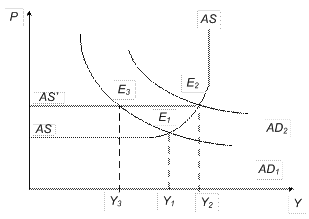 Рисунок 9.7 – Смещение кривой совокупного предложения Если кривая совокупного предложения будет смещаться влево из положения AS 0в положение AS2 (например, в результате роста цен на ресурсы), то это приведет к сокращению реального объема производства с Y 0 до Y 2, а также к повышению уровня цен с P 0 до P 2. Положение, при котором под воздействием падения совокупного предложения происходит одновременное падение реального национального производства и повышение уровня цен, демонстрирует механизм действия стагфляции. Таким образом, анализ простой модели совокупного спроса и совокупного предложения AD – AS показывает, что законам рыночного равновесия подвластна и национальная экономика в целом.