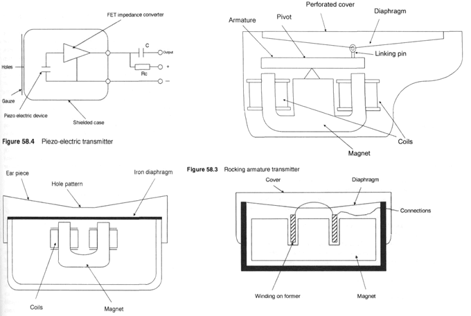 Piezoelectric transmitter Piezo-electric transmitters work on the principle that certain types of quartz crystals become electrically polarised when subjected to pressure from sound waves. Sound impinges on the disc of piezo material, causing the disc to be stressed, varying the charge on the capacitor within the disc, which in turn varies the gate voltage of the FET impedance conversion amplifier, shown in Figure 58.4. The disc and the FET are all housed in a pressed aluminium casing. The apertures at the front of the transmitter have variable hole patterns which are selected to improve the frequency response of the unit.