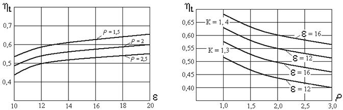 Из выражения 2.17 видно, что термический КПД зависит от степени сжатия и от коэффициента адиабаты. Коэффициент адиабаты к характеризует физические свойства рабочего тела. Для идеальных газов к = const = 1,4. Но для реального рабочего тела, даже с изменением кв узких пределах 1,2…1,4, h t существенно зависит от этого параметра (рис. 2.3) [3]. По графику видно, что степень сжатия при её малых значениях существенно влияет на показатель h t , однако, при её дальнейшем увеличении, начиная примерно с e = 12 …14, это влияние уменьшается. Полезная теоретическая работа цикла зависит от количества подведенного тепла и может быть выражена