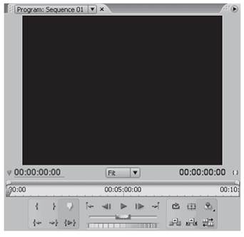 Рисунок 5- Экран Program (Программа) На экране Source (Источник) вы можете просмотреть клипы до помещения в последовательность, а также отредактировав их, обрезав лишние фрагменты (рис. 6). В данный момент в экран Source (Источник) клипы не загружены, поэтому элементы интерфейса этого окна неактивны.